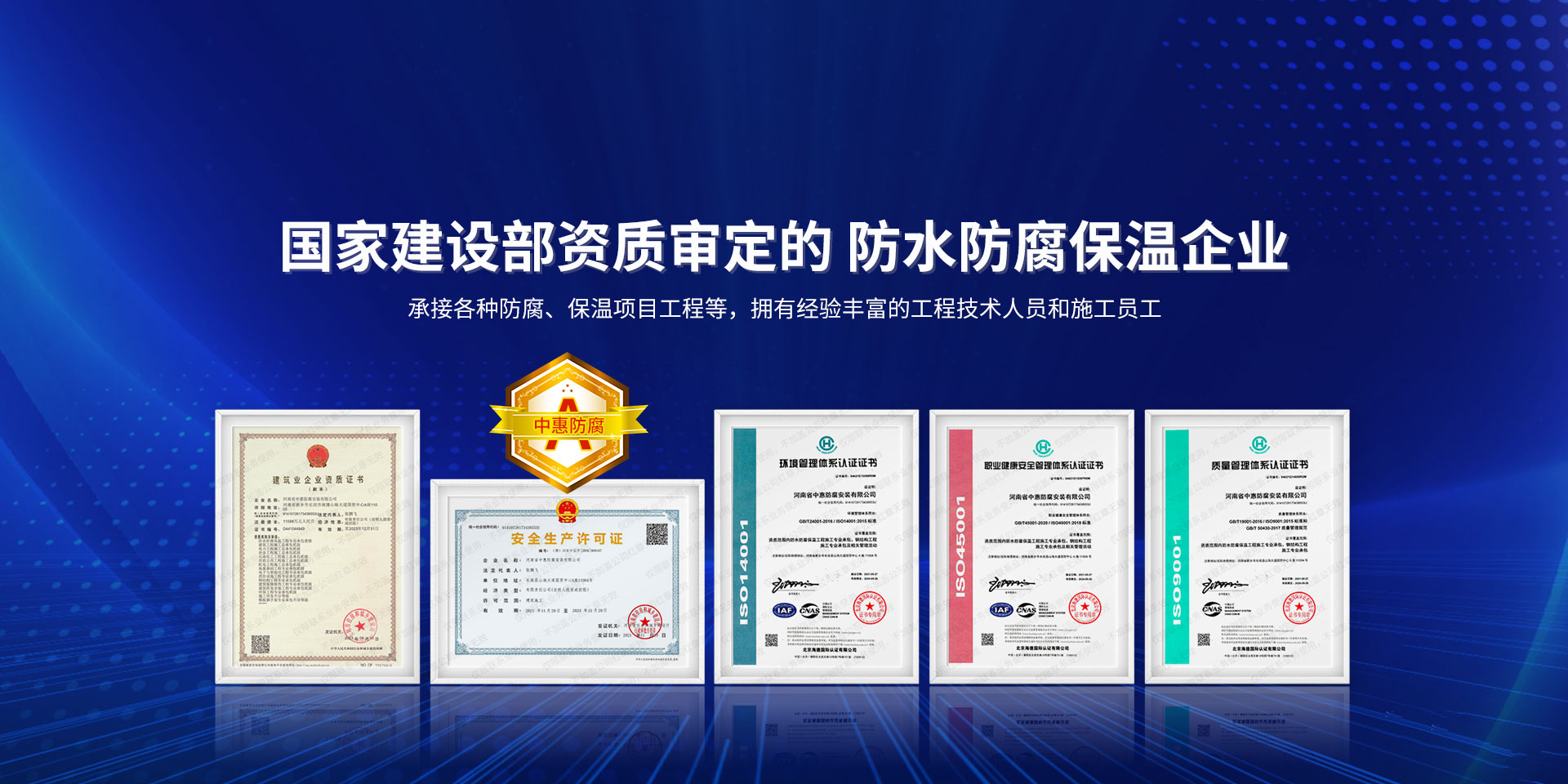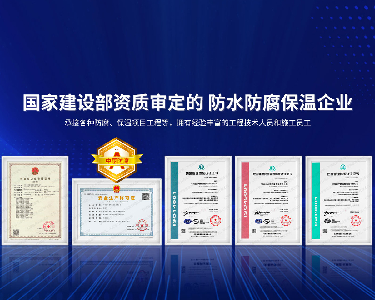 公司經營范圍:防水防腐保溫工程;消防設施工程;建筑裝修裝飾工程;建筑機電安裝工程;電力工程;建筑工程;石油化工工程;工業清洗工程;油罐清洗工程;鋼結構工程;環保工程;模板腳手架工程;電纜防火封堵、防污閃噴涂、外墻外保溫工程;各類施工勞務作業;設備維修、船舶鉚焊、涂裝;電力工程材料、建材、防水材料、防火材料、防腐保溫材料銷售,并相繼通過了GB/T19001-2008idtISO9001:2008GB/T50430-2007質量管理體系認證證書。GB/T24001-2004idtISO14001:2004環境管理體系認證證書。GB/T28001-2011idtOHSAS18001:2007職業健康安全管理體系認證證書。公司是中國防腐蝕于防護協會、中國施工企業管理協會、電力協會和中國鋼結構防水協會會員單位。 公司的經營業務涵蓋了石油、化工、電力、冶金、煤炭、船舶、國防、燃氣、水利、環保、交通運輸、航空及國防軍工和輕紡市政等行業的防腐保溫絕熱設備。鋼結構安裝、防火、防水、金屬噴鍍、聚脲噴繪、陰極保護、防滲透堵漏、玻璃鋼及各種磚版材料襯里、橡膠襯里、煙氣硫和耐酸溶劑腐蝕等工程施工。公司連續十年榮獲“省市先進施工企業”“安全生產先進單位”“重合同,守信用企業”和“AA***資質企業”的稱號。2000年被命名為市級文明單位,2002年被國家工商行政管理局命名為“重合同,守信用的企業”、被中國工業防腐蝕技術協會命名為“防腐蝕企業,能源節約及環境保護領域有豐富的經驗和***的業績。工程一次交驗合格率100%。其中攀枝花鋼鐵公司煉鐵廠四號高爐及熱風爐防腐工程、上海寶鋼公司煤氣柜防腐工程、撫順石油一廠裝置防腐項目、齊魯石化公司稀烴廠高塔防腐工程、吉林化學工業公司煉油廠油罐防腐工程、天津石化熱電廠六號爐頂棚聯絡管保溫工程、大慶油田(太倉)力神泵業工程、中國化學工程第十一建設工程、中原油田勘探局工程、中國石化銷售有限公司華北分部、魯皖輸油管道工程、貴州開磷息烽合成氨工程、陜西黃陵煤化工程、中國石油天然氣西部管道塔里木輸油工程、邯鋼集團邯寶鋼鐵公司煉鐵工程、德州供電工程、吉寶(南通)船廠工程,偃師華潤熱力工程、鄭州熱力總公司。 河南省中惠防腐安裝有限公司愿以豐富的施工經驗,***的技術,***的設備,***的管理,***的服務,竭誠為國內外廣大的用戶提供***滿意、******的工程作品。 我公司愿與國內外同仁一道,團結協作,共同推進防腐蝕行業發展! 公司地址:河南省長垣縣建設路北段360號 固定電話:0373-8866488 郵編:453400 網址:http://www_zhff_com_cn.xiangyingmedia.com